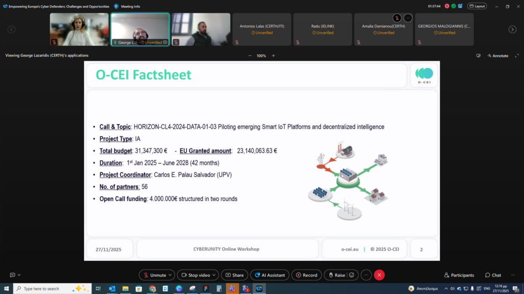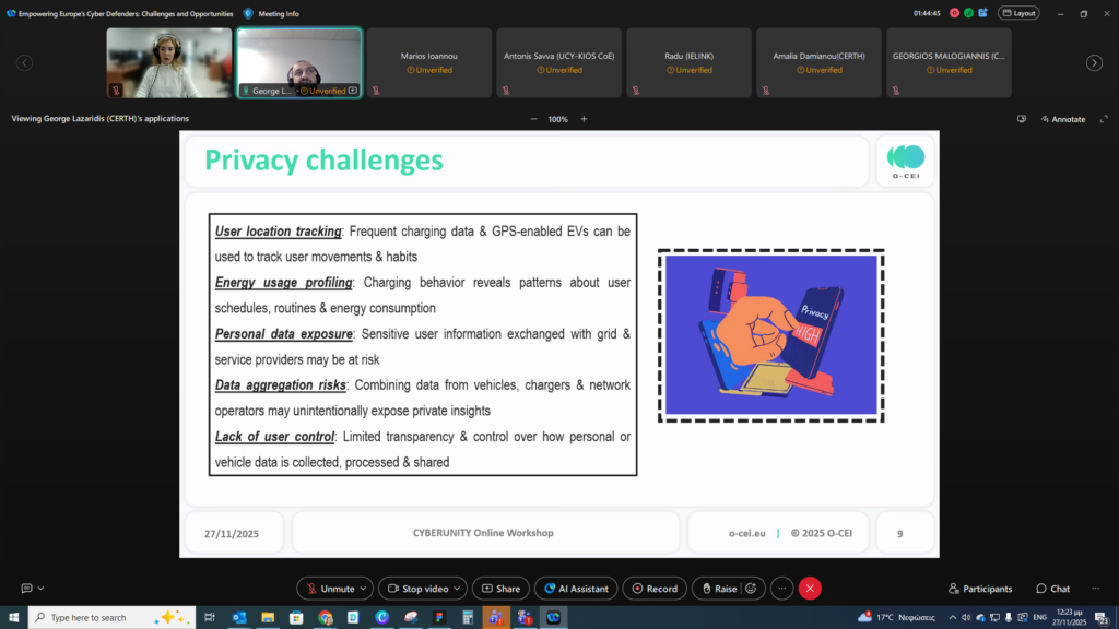 Finally, in November, CERTH presented O-CEI and Pilot 7’s cybersecurity aspects at the CYBERUNITY online Workshop. Their presentation, titled “Protecting Europe’s New Attack Surface: Cyber-Resilient EV Charging Infrastructures,” underscored the pilot’s crucial role in securing Europe’s energy transition.