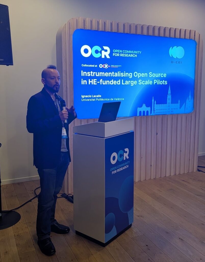 O-CEI was represented by Ignacio Lacalle Ubeda (from Universitat Politècnica de València, O-CEI coordinating partner), who presented the project’s approach to integrating open source into large-scale pilots. His intervention showcased how O-CEI combines research, industrial collaboration, and open-source development to support the creation of interoperable services across domains. The presentation introduced key O-CEI concepts, including the O-CEI marketplace, the development of blueprints, and the project’s platform as a technological backbone for the Cloud–Edge–IoT continuum. A strong emphasis was placed on making project results openly available to foster reuse, scalability, and adoption by the broader ecosystem.